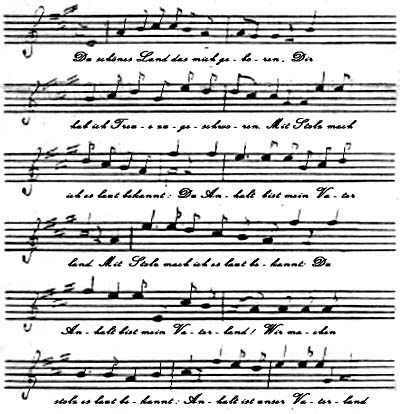 schönes Land, das mich geboren, Dir hab ich Treue zugeschworen. Mit Stolz mach ich es laut bekannt: Du Anhalt bist mein Vaterland. Mit Stolz mach ich es laut bekannt: Du Anhalt bist mein Vaterland! Wir machen stolz es laut bekannt: Anhalt ist unser Vaterland! Wie oft schon ist dem Ruhm